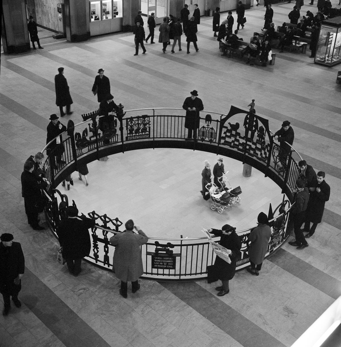 Öppningen i väntsalsgolvet mellan våningsplanen, ner till passagen mellan delar av Centralstationens spår och tunnelbanan.
