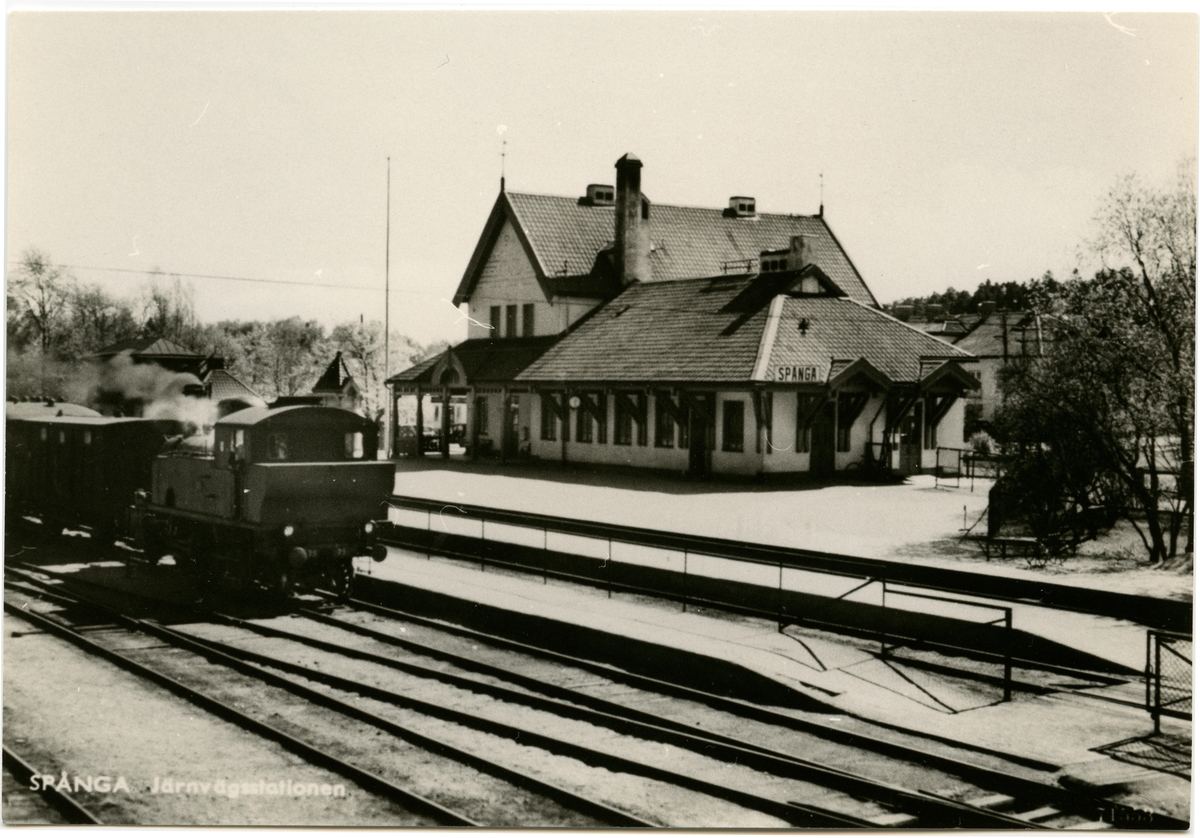Spånga station. Stockholm-Västerås-Bergslagens Järnväg, SWB. Stationen invigdes 15/12 1876. 1908 byggdes ett nytt stationshus som revs 1975 och ersattes med en plåtbyggnad. 2004 byggdes ett nytt stationshus. Sedan 1969 är Spånga bara en pendelstågsstation. SWB Y3 75 eller SWB Y3 79.