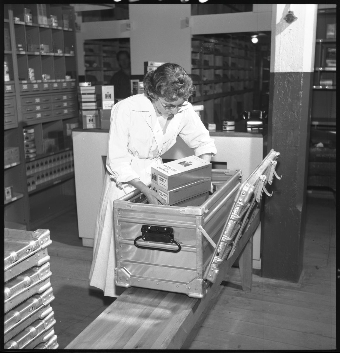 Kvinna instruerar hur man monterar småbehållare SJ La 10386, hopfällbar box av plåt.