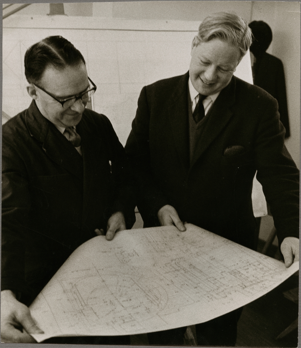 Ritare Martin Fröberg till vänster och Ingenjör Folke Hellstedt till höger vid Trafikaktiebolaget Grängesberg - Oxelösunds Järnvägar, TGOJ verkstad i Kopparberg.