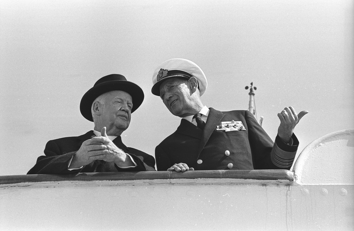 Invigning av "Fågelvägslinjen" mellan Rodbyhavn, Lolland, Danmark och Puttgarden, Fehmarn, Tyskland. Den nya färjelinjen kallas "Fågelvägslinjen", på danska Fugleflugtslinien och på tyska Vogelflugslinie, eftersom linjen följer flyttfåglarnas flygrutt. Danmarks kung Frederik IX, till höger