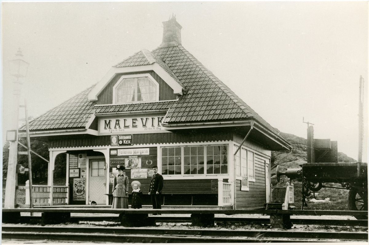 Banvaktsfamiljen på Maleviks hållplats poserar framför kameran. Till höger i bild syns Göteborg Särö Järnväg, GSJ M-vagn nr. 30. Observera belysningsanordningen till vänster i bild.