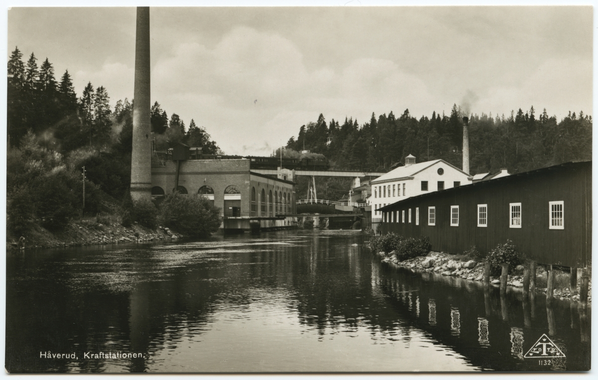 Vy av kraftstationen i Håverud med ett ånglok och personvagnar i bakgrunden.