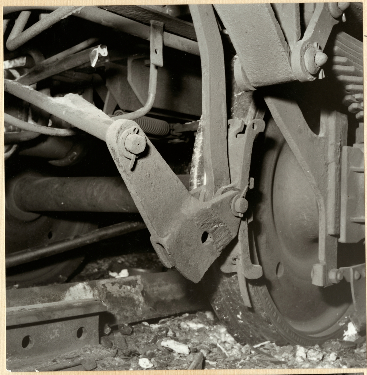 Statens Järnvägar, SJ Mas malmvagn skadad efter urspårning den 17/4 1956 på sträckan mellan Vassijaure och Hundalen. Närbild på hjulet med räls som gått sönder.
