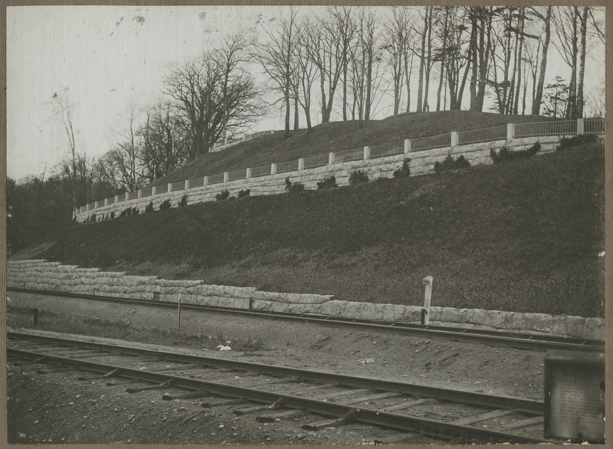 Dubbelspårsbanbyggnad Göteborg - Alingsås. Stödmurar vid herrgården i Jonsered, år 1916.