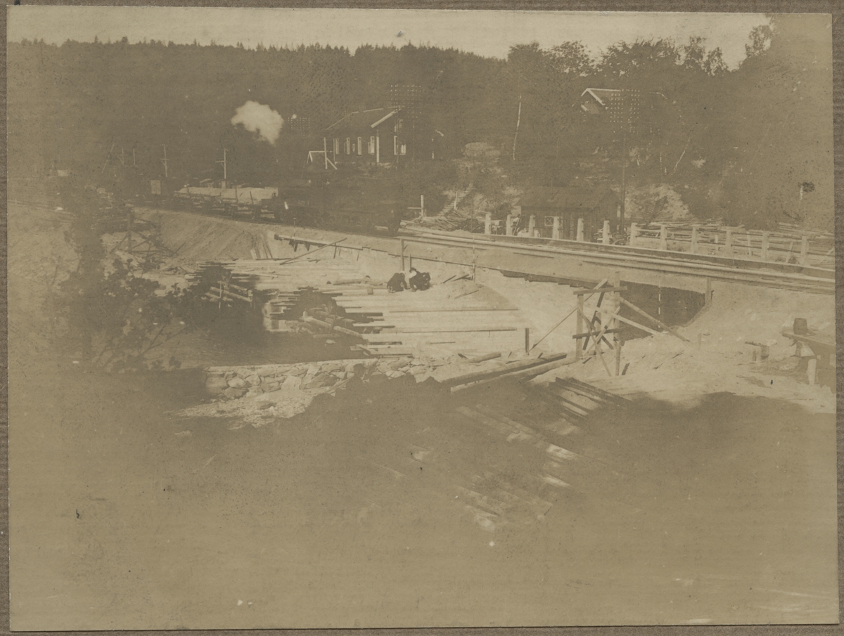 Titel: Dubbelspårsbanbyggnad Göteborg - Alingsås. Formsättning av södra brohalvan vid Norsesund år 1916.