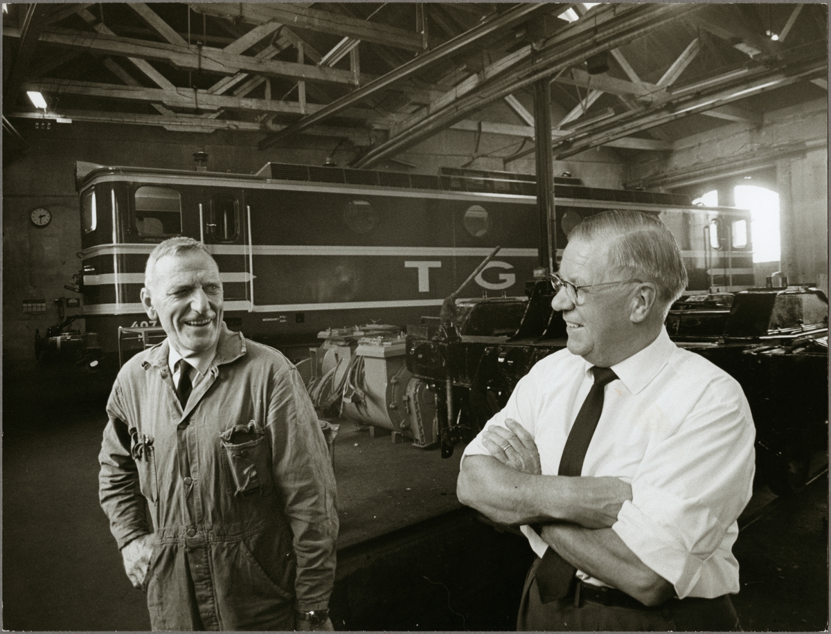 Lagbasen Torsten Tollin och Förste Verkmästare David Pilstad med Trafikaktiebolaget Grängesberg Oxelösunds Järnvägar, TGOJ Ma 407 i bakgrunden.