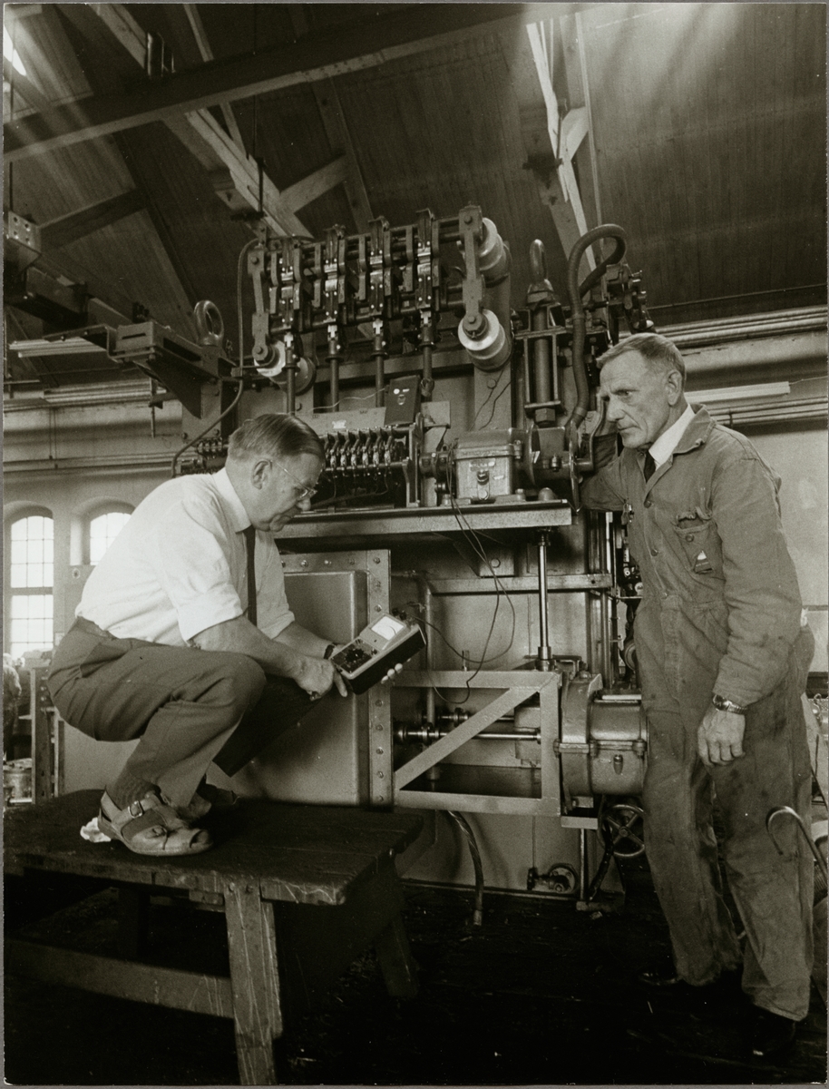 Förste Verkmästare David Pilstad och lagbasen Torsten Tollin kontrollmäter kampådraget i huvudtransformatorn.