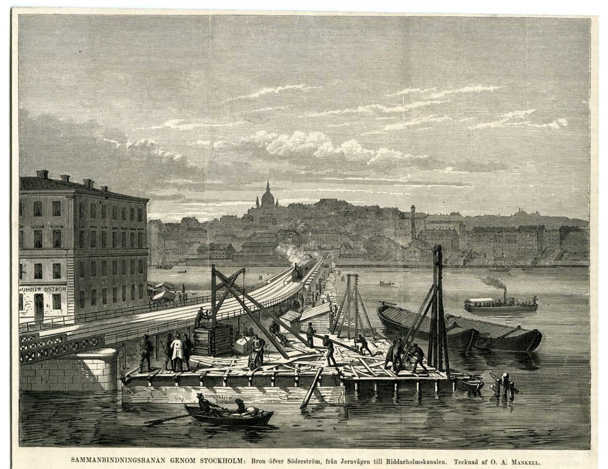 Sammnbindningbanan genom Stockholm bron över Söderström, från järnvägen till riddraholmen. tecknad av O. A. Mankell.
