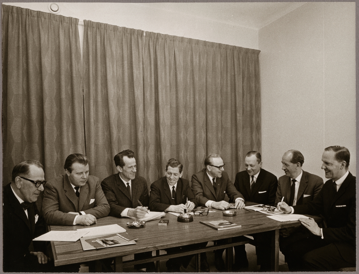 Herrarna bakom Konduktörsposten, Trafikaktiebolaget Grängesberg - Oxelösunds Järnvägar, TGOJ´s egen medlemstidning. Från vänster i bild: Lennart Tollin, Ragnar Eriksson, Gunnar Bergström, Olof Häll, Axel Jerlehagen, Fritz Asklöf, Ruben Seger och Bengt Holmberg.