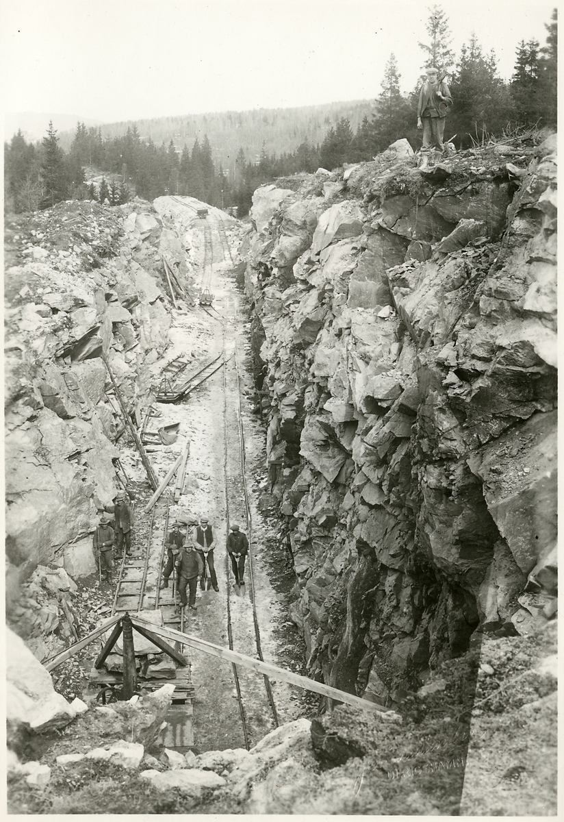Bergskärning vid 2/400 längs linjen mellan Ulricehamn och Jönköping. Decauvillespår, de färdiga rälslängder användes som provisoriska banor för banarbetsfordon.