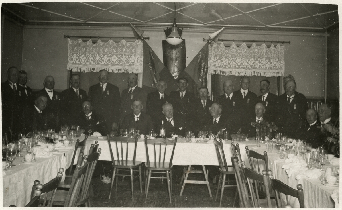 Högre befälet och medaljörerna vid den av Kungliga Järnvägsstyrelsen arrangerande festmåltiden den 30 September 1933 å Centralhotellet i Arvidsjaur i anledning bandelens Arvidsjaur - Sorsele öppnande för allmän trafik.