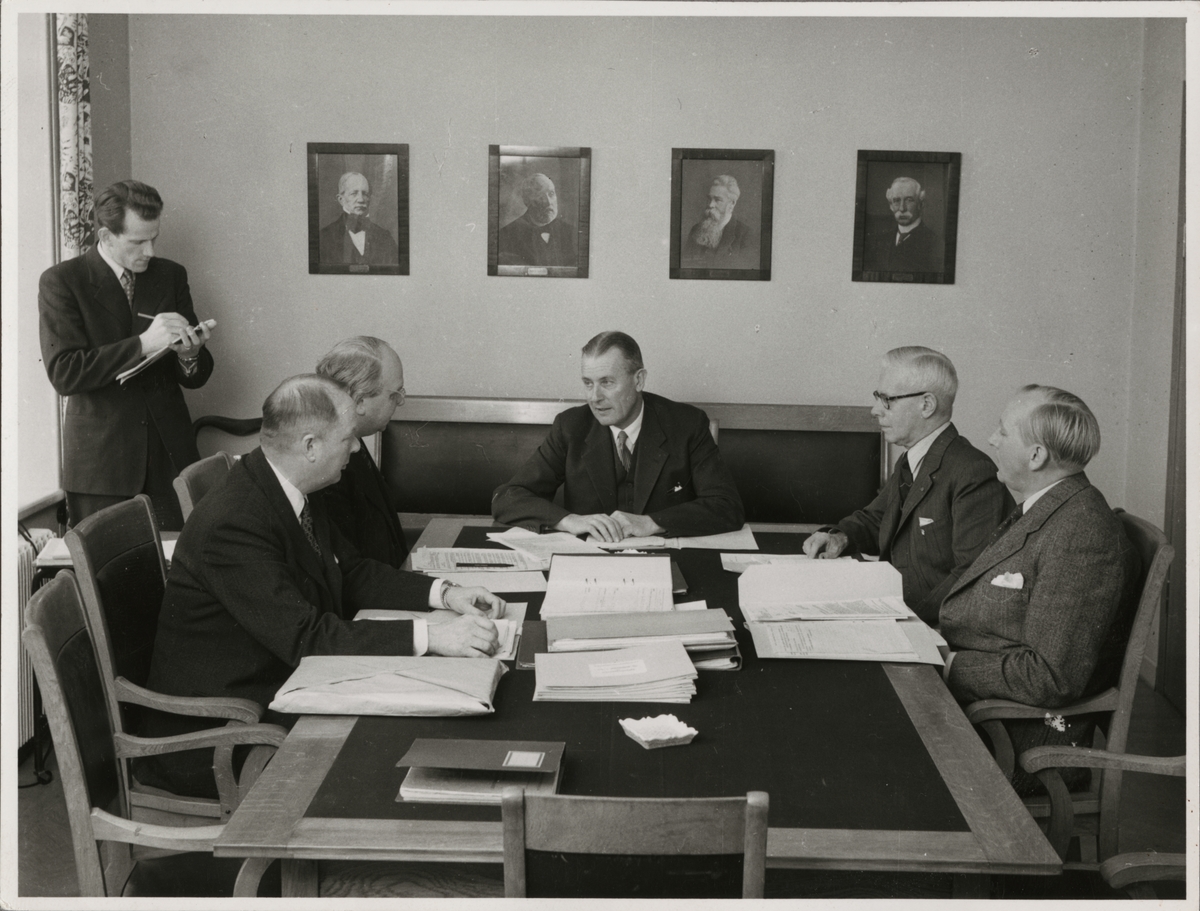 Trafikaktiebolaget Grängesberg - Oxelösund, TGOJ. Förvaltningsmedlemmar samlade runt ett bord. Från vänster: Gunnar Bergström, Sture Nortorp, Bo Ytterberg, Lars Granfeldt, Sven Lagergren och Åke Karlström.