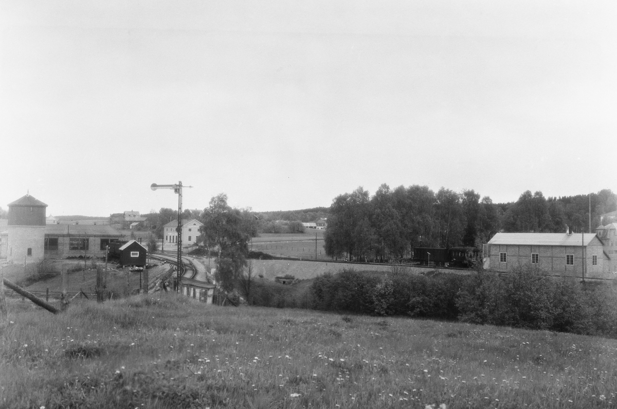 Till höger Åmål - Årjängs Järnvägs lokstall. Till vänster Dal - Västra Värmlands Järnvägs lokstall. Stationshuset mitt i bilden.