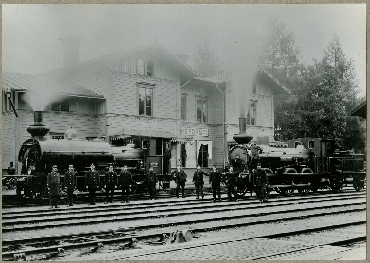 Hofors station. På spåret syns Gävle-Dala Järnvägs ånglok, GDJ B 10 "Thore Petré" och GDJ C 24, "Sölve". Personal, från vänster: Stins Lagerström C R, född 1832, avliden 1901. Söderlund, stationsmästare i Valbo 1913. Wallér, Lund, Ahlbom, lokförare. Lokförare Björklund,. J W Lindgren, trafikchef vid Dala-Ockelbo-Norrsundets Järnväg från 1920. Skog, lokförman. Östlund lokförare. J Jonsson. Lokförare Gustaf Åström. Banvakt Sjöblom.