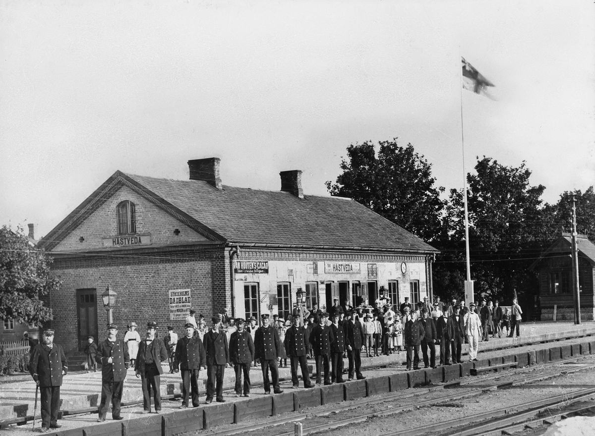 Hästveda stationshus med unionsflagga.