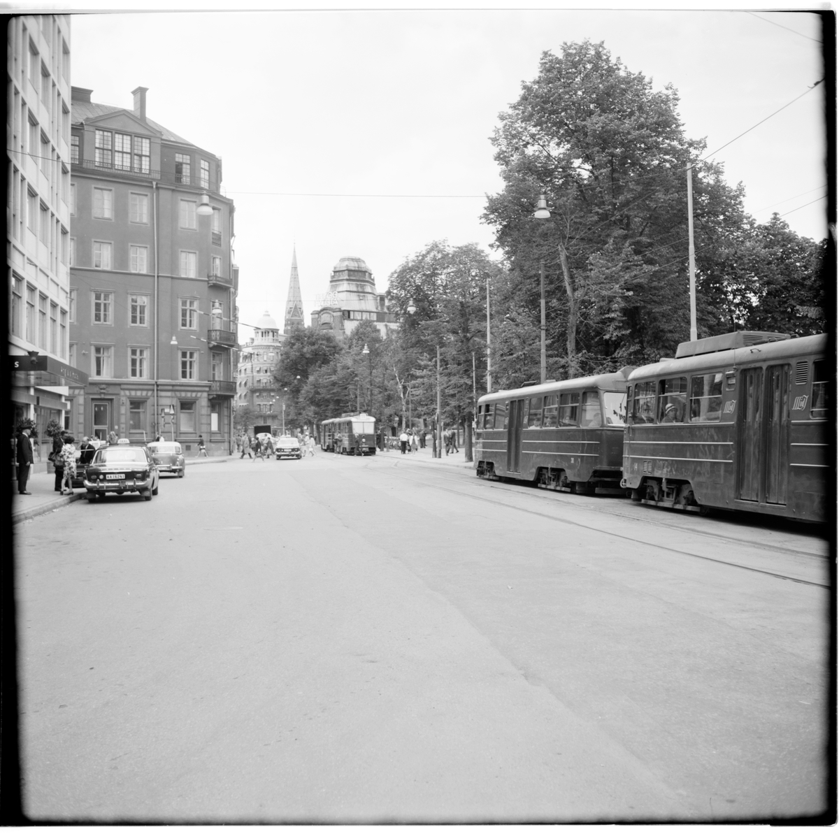 Trafik Aktiebolaget Stockholm Södra Lidingöns Järnväg, SSLidJ A24(A) 14 "ängbyvagn" och B24(A) 30 vid ändhållplats Humlegårdsgatan. Ett tåg framkört för avgång. Ett tåg just inkommet där avstigning pågår.