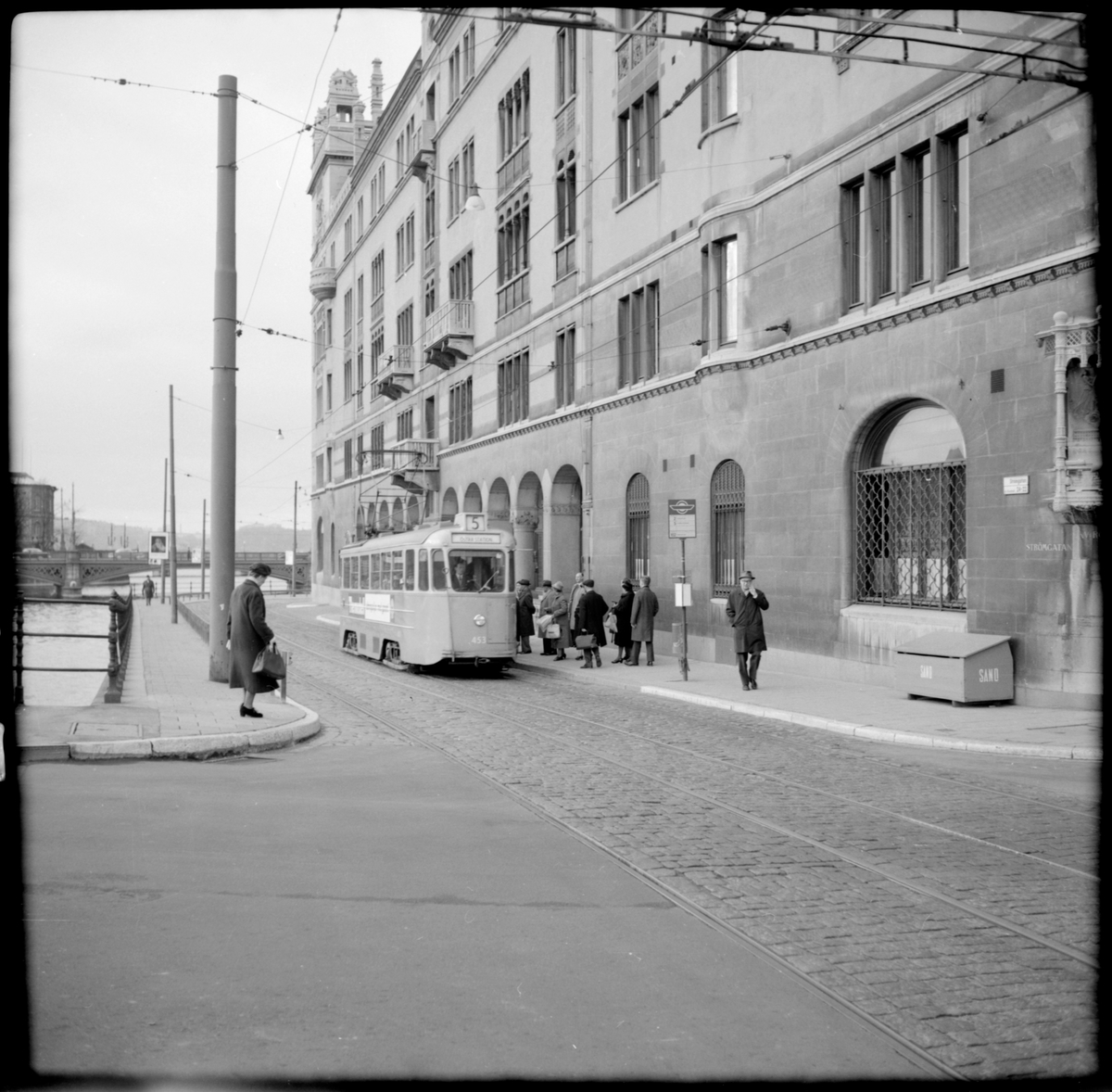 Resande till Aktiebolaget Stockholms Spårvägar, SS A25 453 "mustang" linje 5 Karlberg - Gustaf Adolfs torg - Östra station vid hållplats Strömgatan.