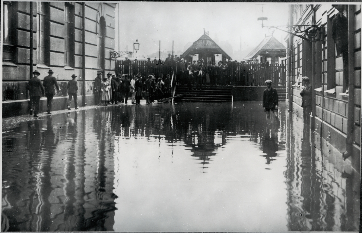 Översvämning i Mäster Samuelsgatan mellan Vasagatan och Centralbangården. Efter foto Svenska Dagbladet. Spärrarna vid Mäster Samuelsgatan för lokaltåget norrut över Stockholm Västerås Bergslagens Järnväg. Obs! Till vänster nedgång till person tunneln under bangården.