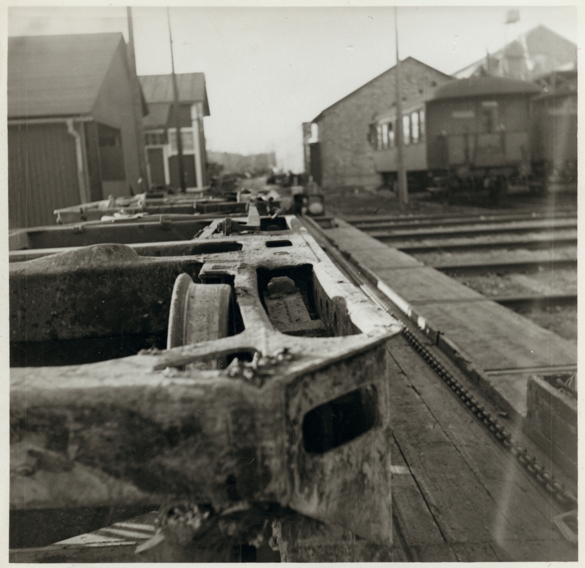 Titel: Skador på A-vagnens löpboggi efter olycka vid hållplatsen Arket 1951.