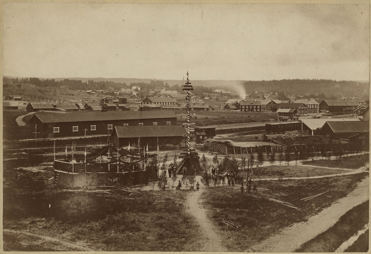 Vy över Kopparberg och järnvägsstationens bangård vid verkstaden. Midsommarfirande i förgrunden.