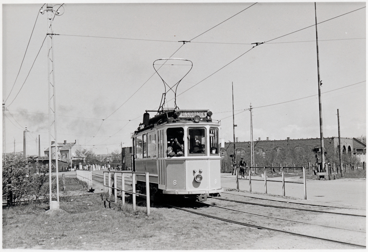 Järnvägsövergång, spårvagn korsar järnvägen. Hälsingborgs Stads Spårvägar, HSS A2 8.