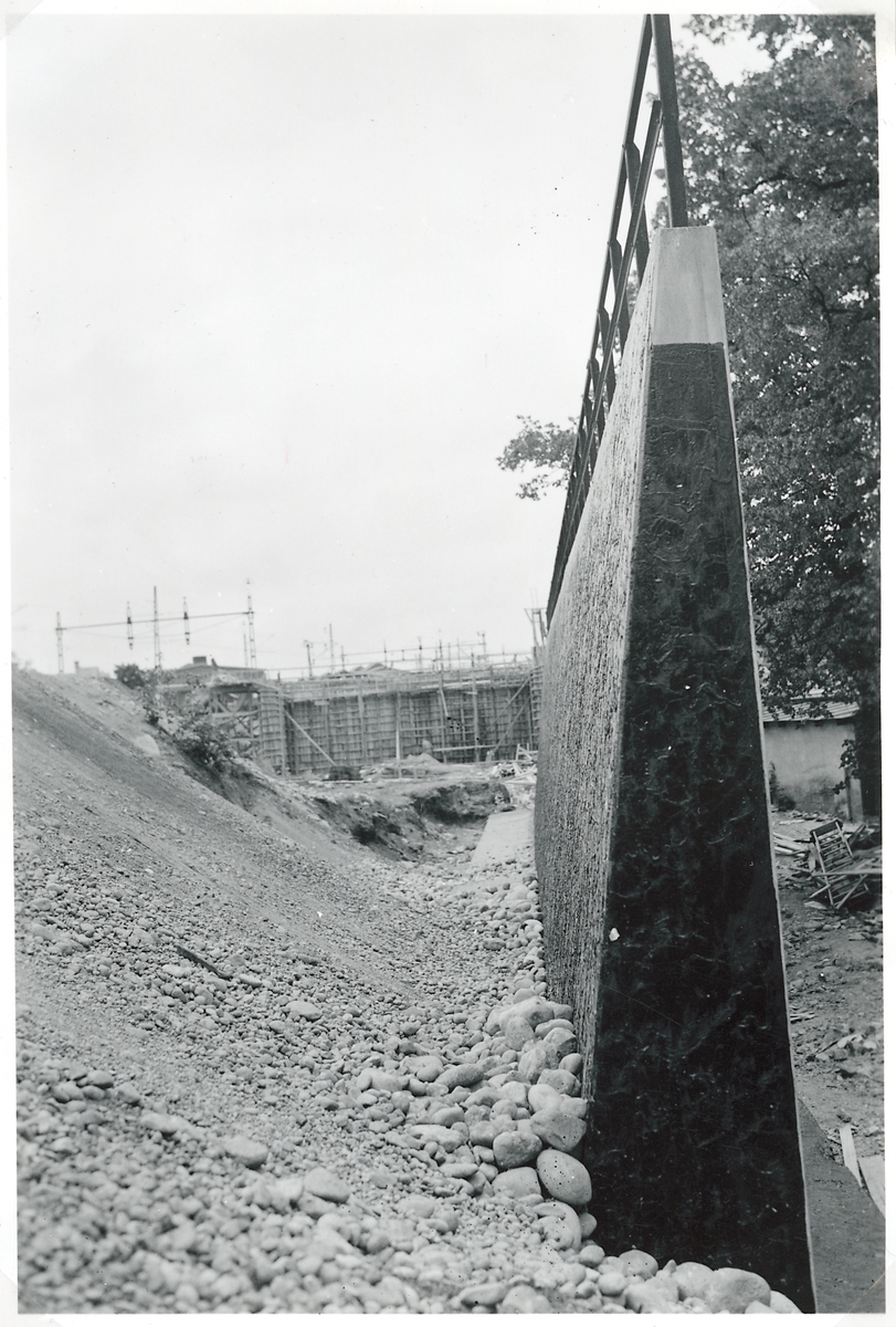 Uppförande av stödmur för järnvägsbanken vid byggnationen av ny järnvägsviadukt över Norrtullsgatan. Belägen ca 100 m öster om östra landfästet i nya vidaukten. Fyllningen bakom muren pågår.