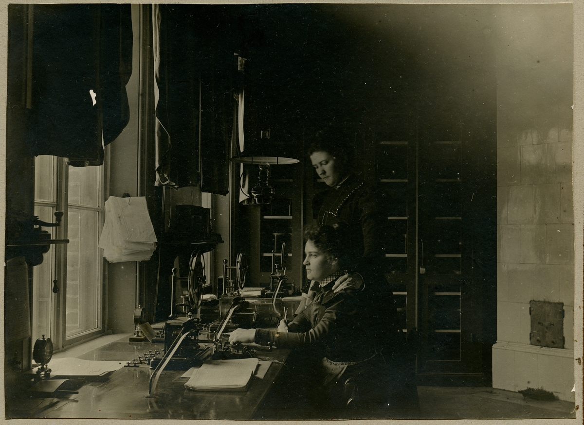 Interiör från telegrafexpedition vid Herrljunga station. Stationen öppnade 1863. Harriet Hedborg och Agda Lagergréen tjänstegörande på Herrljungas Telegrafexpedition. Båda var anställda som kontorsbiträden.
