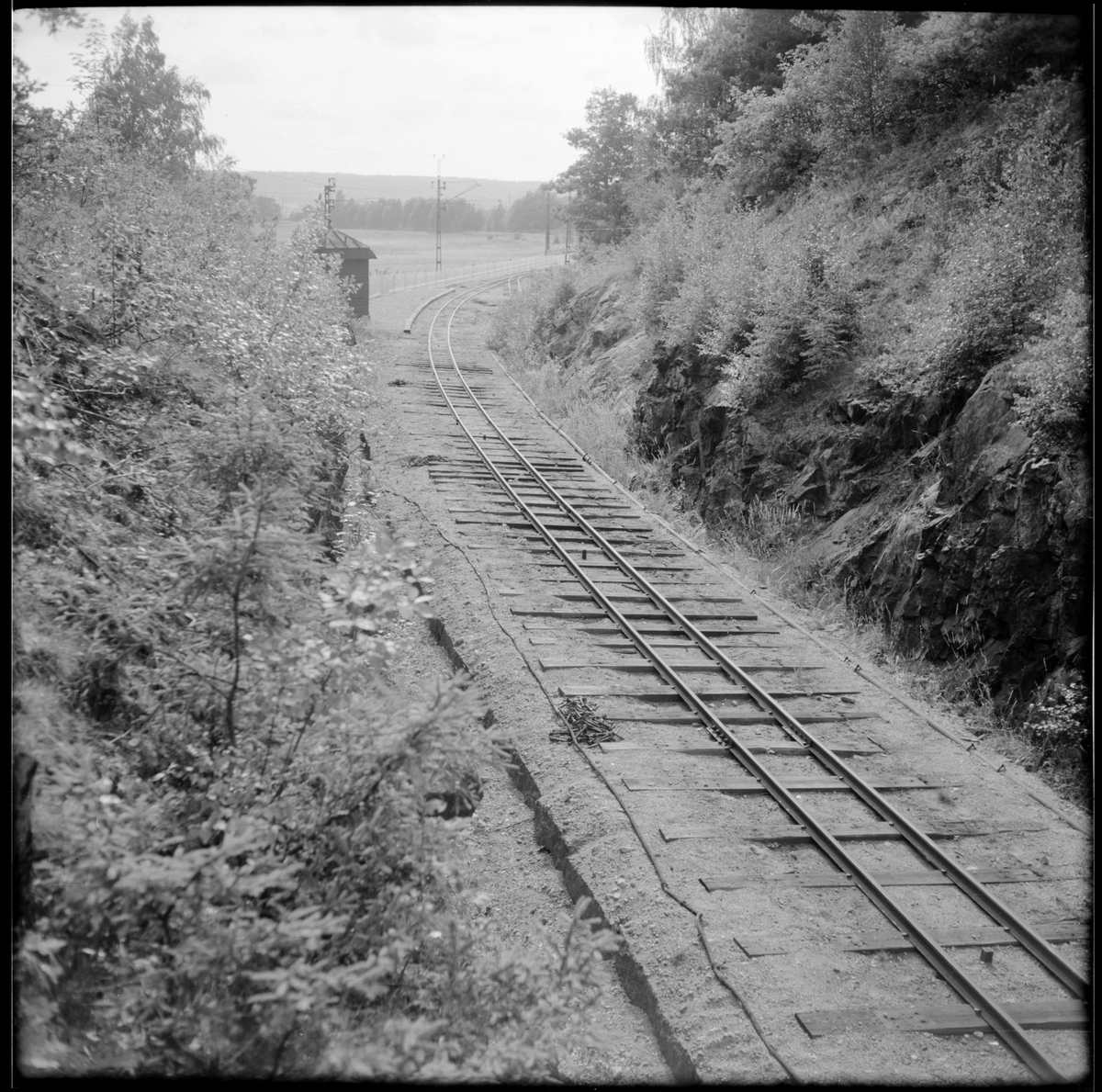 Vy över smalspår vid Läggesta Östra station på sträckan mellan Läggesta - Marifred. Till vänster i bild ses Stationshuset som är en kur från Saltsjöbanan tillhörande Museijärnvägen, Östra Södermanlands Järnväg, ÖSlJ.