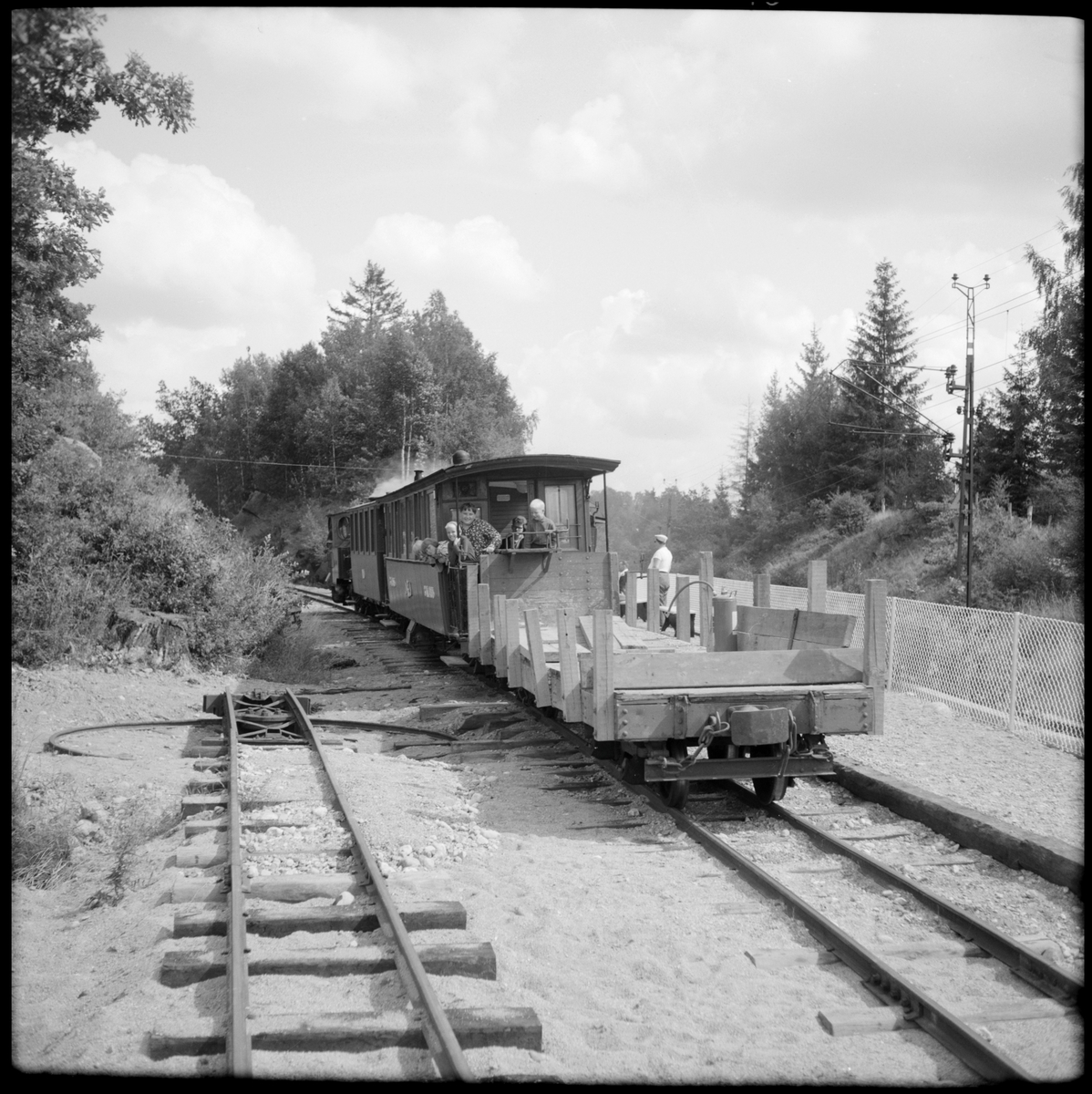 På Läggesta Östra station ses resande på Museijärnvägen, Östra Södermanlands Järnväg, ÖSlJ 3:e klass personvagn Jönköping - Gripenbergs Järnväg, JGJ kopplad med en restaurerad godsvagn på sträckan Läggesta - Mariefred. Vändskiva till vänster i bild.