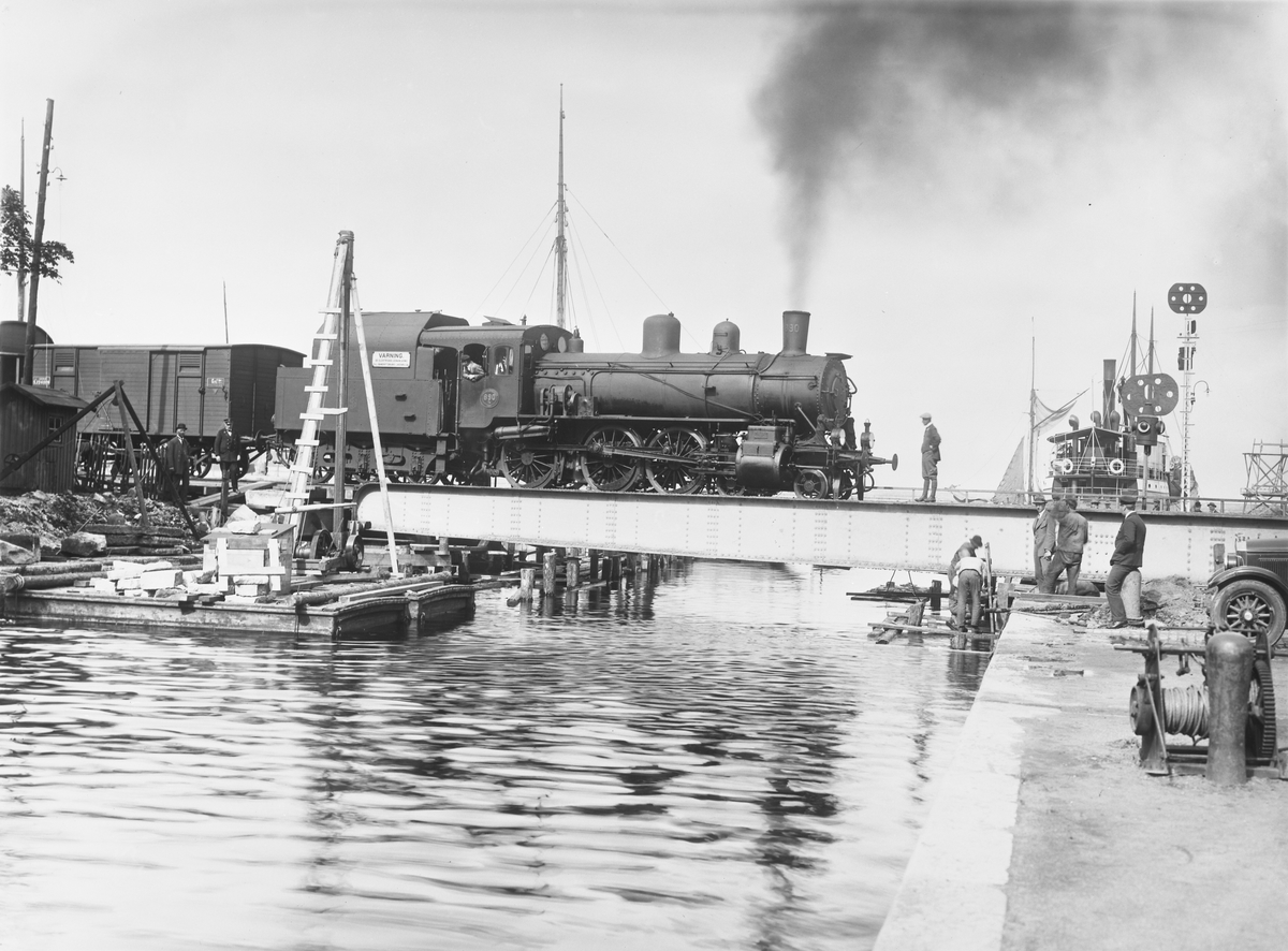 Byte av järnvägsbro. Tåget, lätta godståget 7571, dras av torvpulvereldade SJ Tb 890.