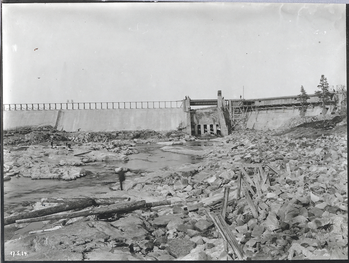 Porjus vattenkraftverk under byggnation. Stora älvfåran efter dämning.