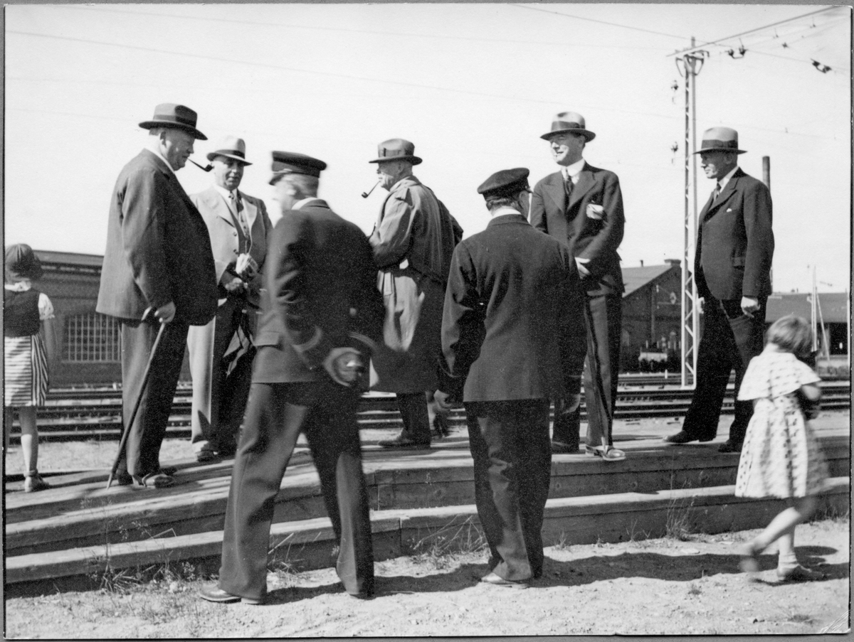 Generaldirektör Granholm (till vänster) på inspektionsresa i Kiruna. Den lilla flickan med katt i famnen (till höger) har just frågat generaldirektören: 'Vet farbror vem som rår om kattungen'?