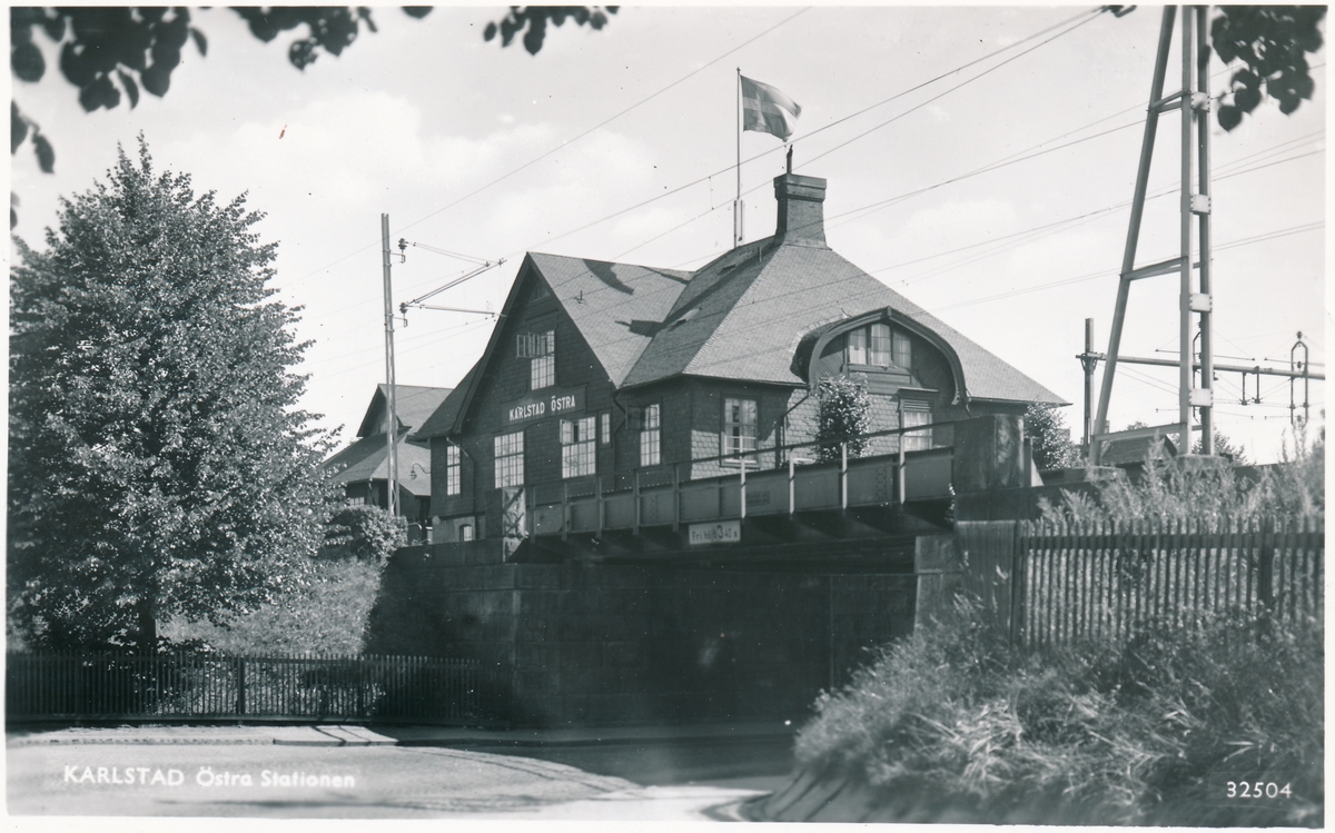 Stationshus från gatusidan. Stationen tillkom 1903 enligt överenskommelse mellan SJ, Statens Järnvägar och KMJ, Karlstad - Munkfors Järnväg. Från 1970 ingick stationen i Karlstad Central. Stationshuset rivet 1971.