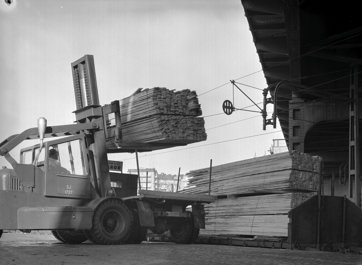 Större gaffeltruck i kajtjänst, Liljeholmen. Lastning av virke på lastbil