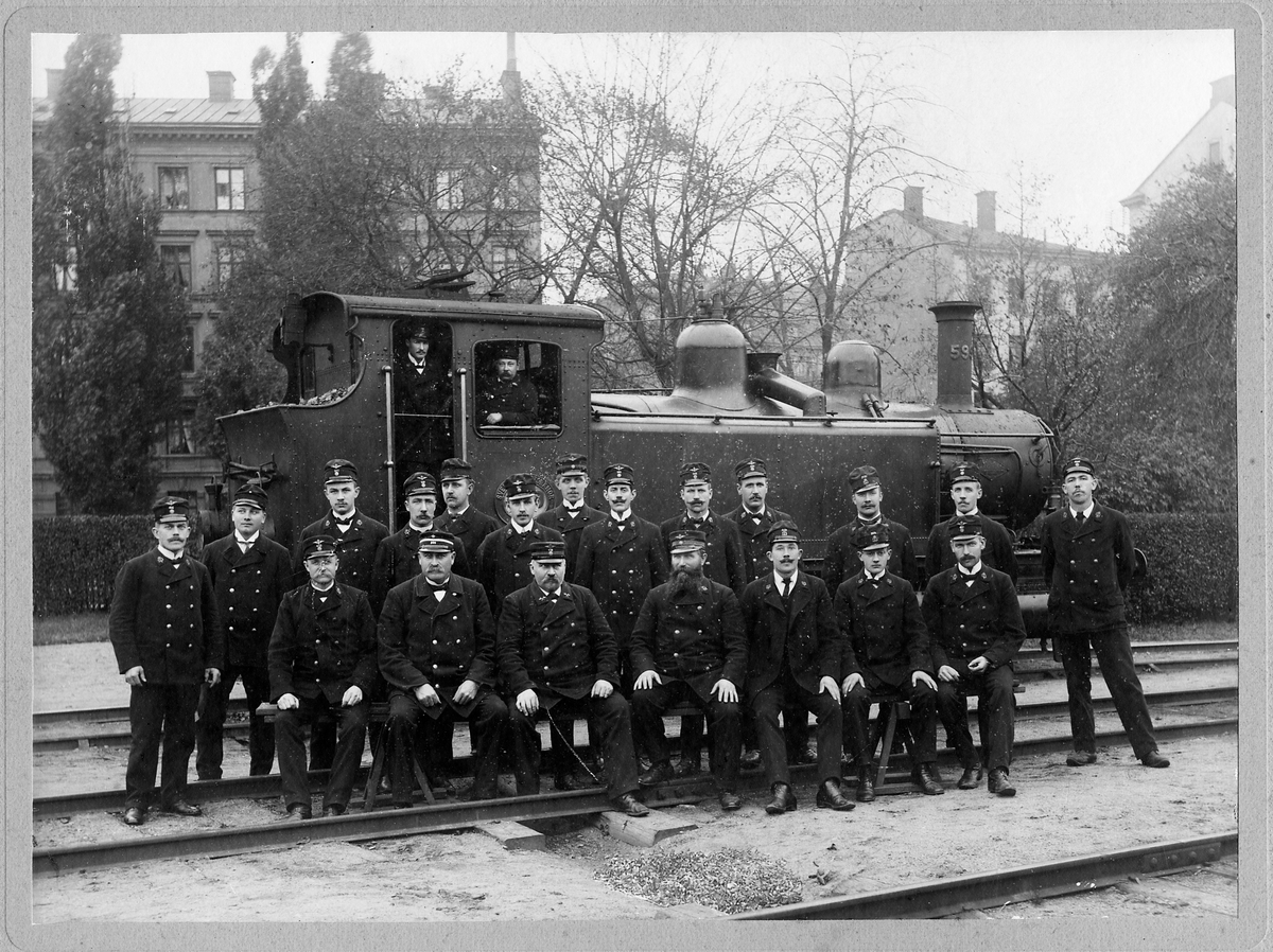 Statens Järnvägar, SJ U 599. Personal vid Stockholm Södra. I förarhytten lokeldare Korsner och stationskarl Höglund.