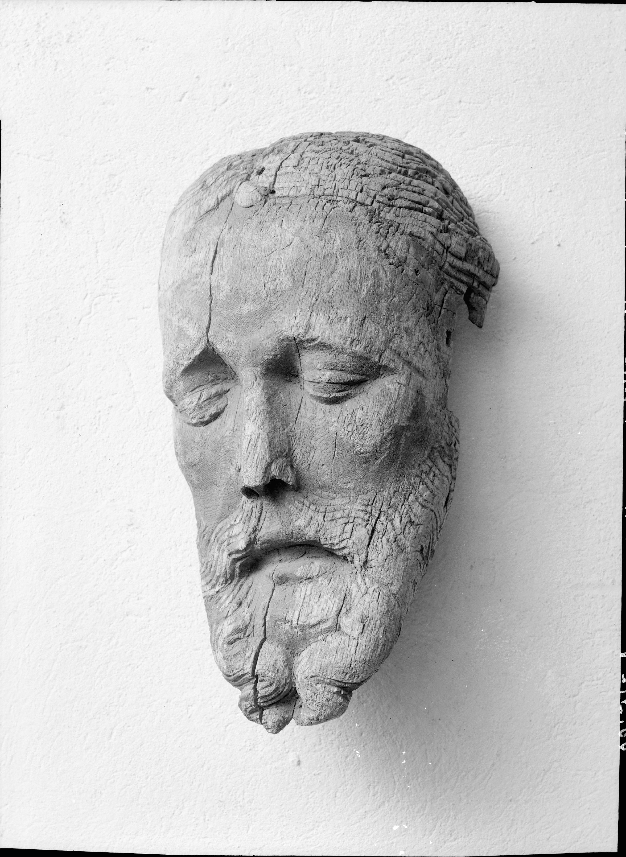 Huvud av kristusfigur, lövträ, 1300-talet.