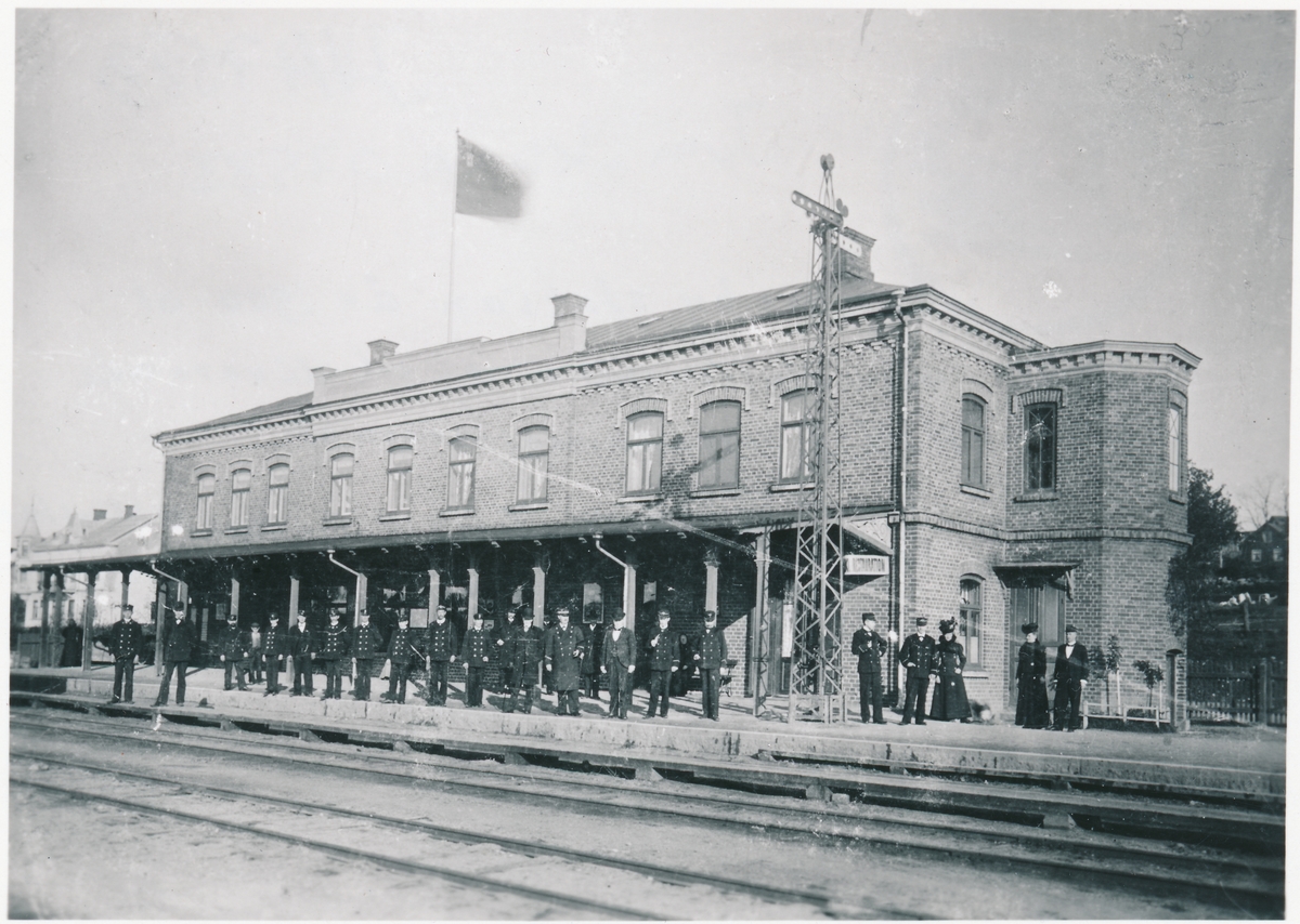 Mellersta Blekinge Järnväg, MBIJ. Ronneby station år 1900 - 1901 med stationspersonal och dåvarande MBIJ förvaltningspersonal.