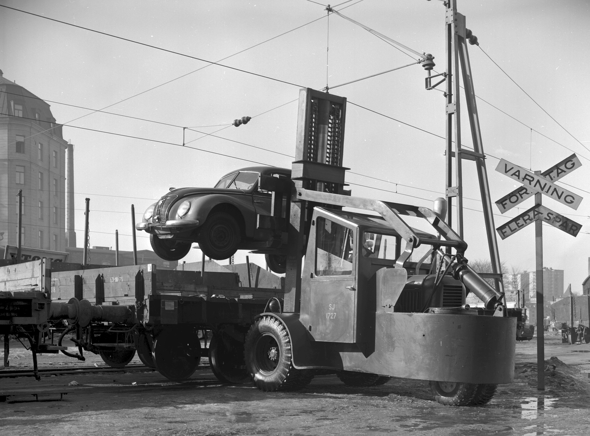 Större gaffeltruck i kajtjänst, Liljeholmen. Varningsskylt