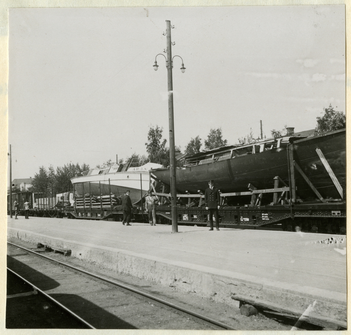 Östersund station. Statens Järnvägar, SJ. En fartygstransport till Storuman passerar Östersund 1923.