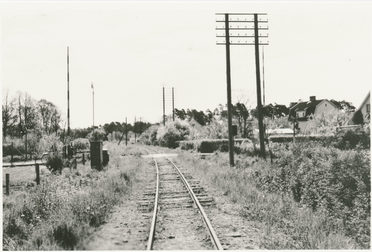 Linjebild vid Gotlands Järnväg. GJ var det första och största järnvägsbolaget på Gotland. Järnvägen förstatligades 1947. Den allmänna trafiken lades ned 1960. Enskild godstrafik i Visby Andelsslakteris regi bedrevs på sträckan Slakteriet-Visby hamn fram till maj 1962.