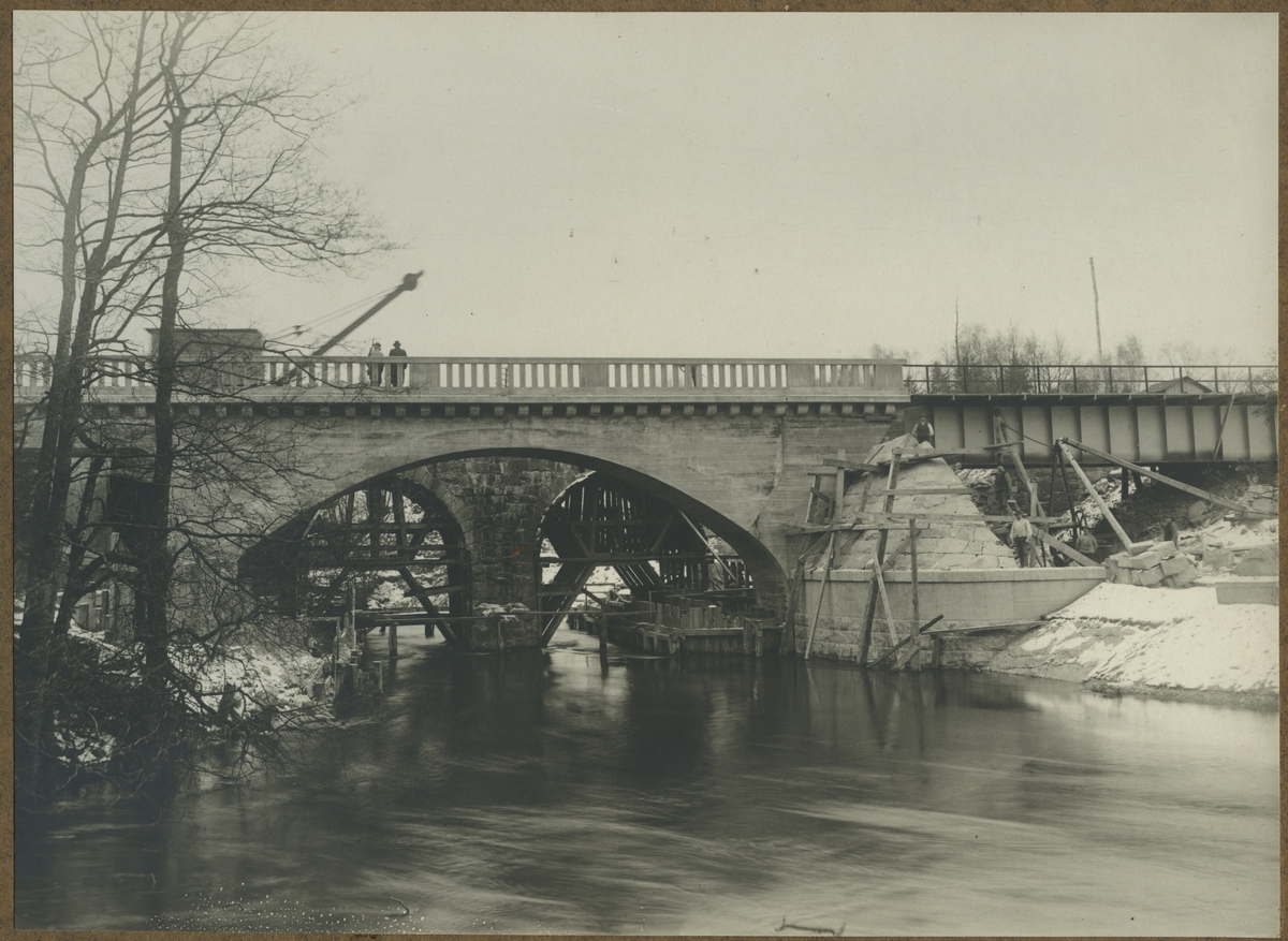 Dubbelspårsbyggnaden mellan Alingsås - Olskroken. Lerumbrons södra halva färdiggjuten och upplåten för trafik. I bakgrunden synes gamla bron under rivningen.