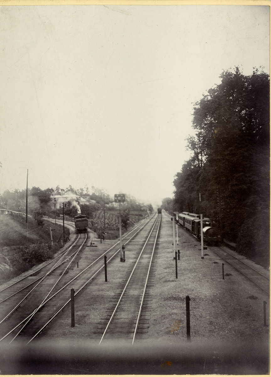 Norra änden av Tomteboda bangård. Till vänster Stockholm - Västerås - Bergslagens Järnvägs, SWB, spår mot Sundbyberg och Västerås. Bortåt i bild Norra stambanan mot Uppsala. Loket till vänster SWB lok 41 och till höger SWB lok 2.