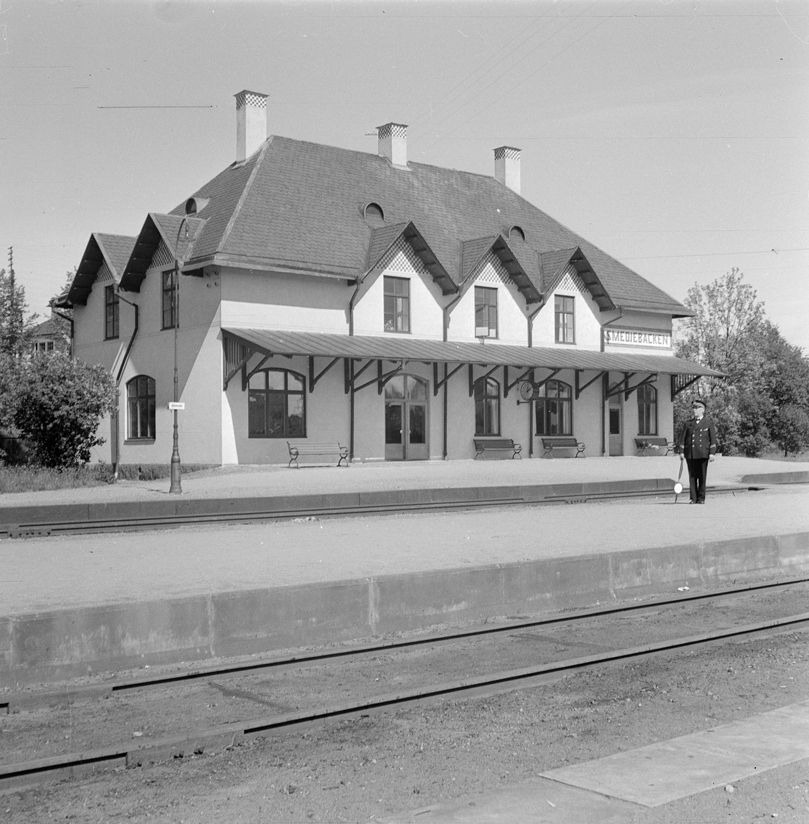 Smedjebacken station anlagd 1902. Järnvägen elektrifierades 1956. Allan Ludvig Schlegel, född 1885 och stationsinspektor, 1922-1945, står beredd på plattformen.