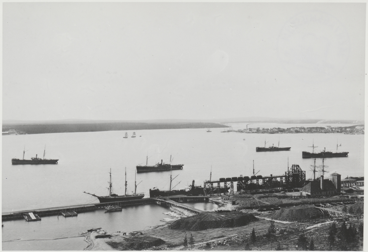 En del av lastageplatsen med elevatorn och maskinhus. Några malmångare väntar på att få inta last. I bakgrunden på udden syns en del av Luleå stad