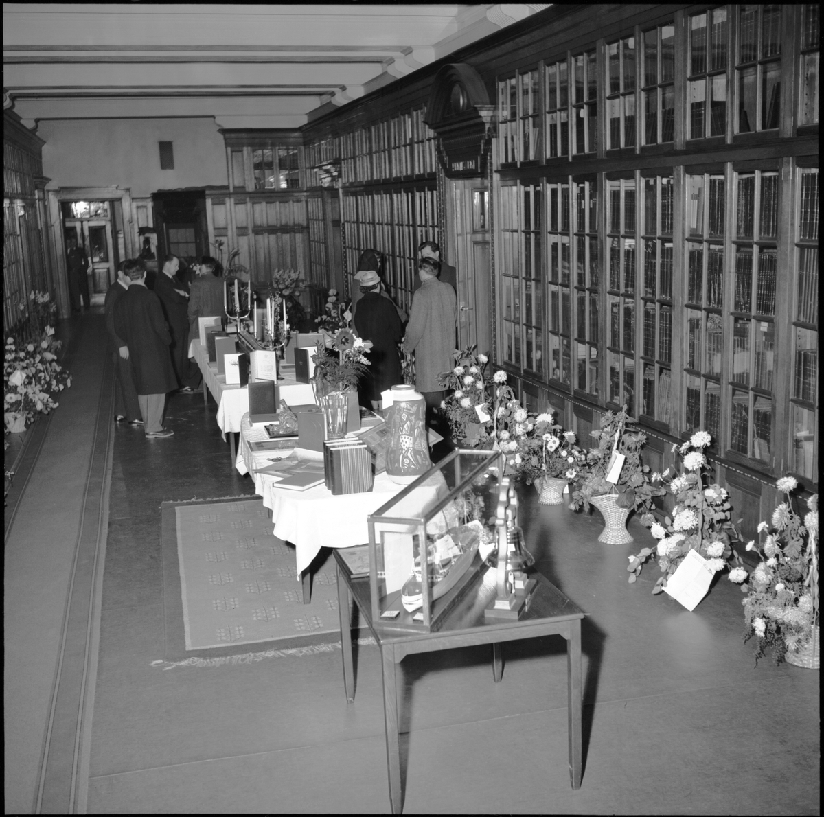 Utställning av100-årsjubileums gåvor i hallen framför plenisalen.