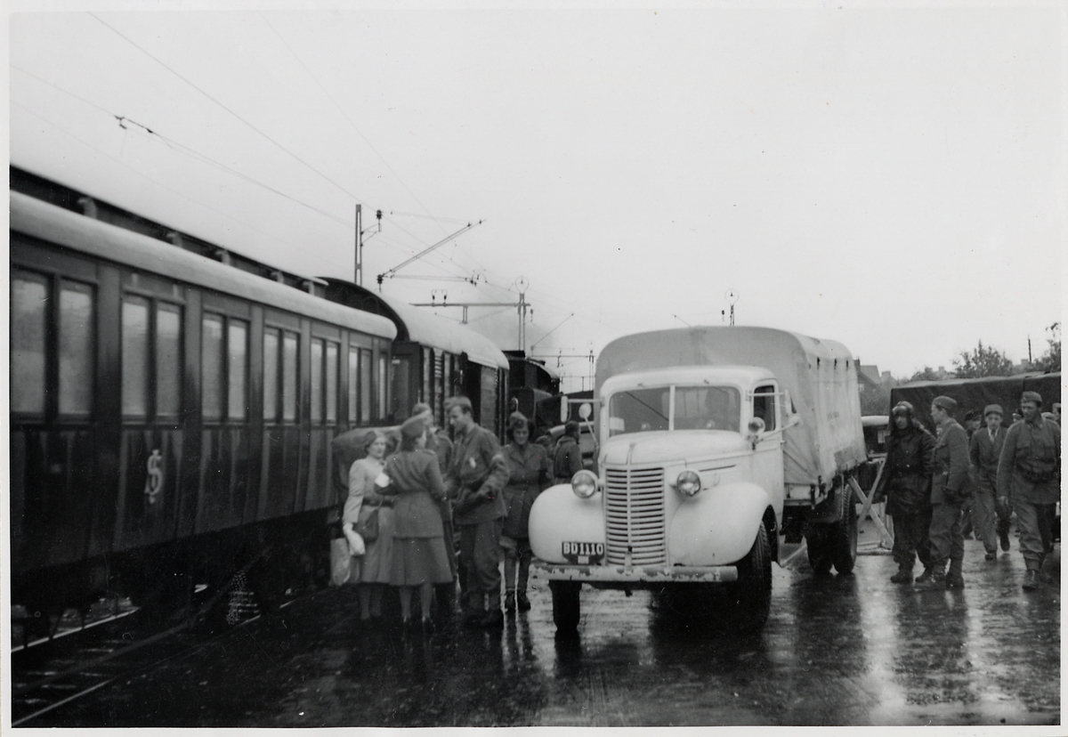 Vid Kiruna station under finska evakueringen, hösten 1944. Svenska Rödakorsets ambulans, registreringsnummer BD1110.