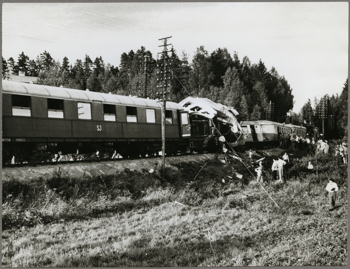 Hjälparbete efter kollision mellan ett extratåg och ett rälsbusståg på linjen mellan Grycksbo och Sågmyra 1958.