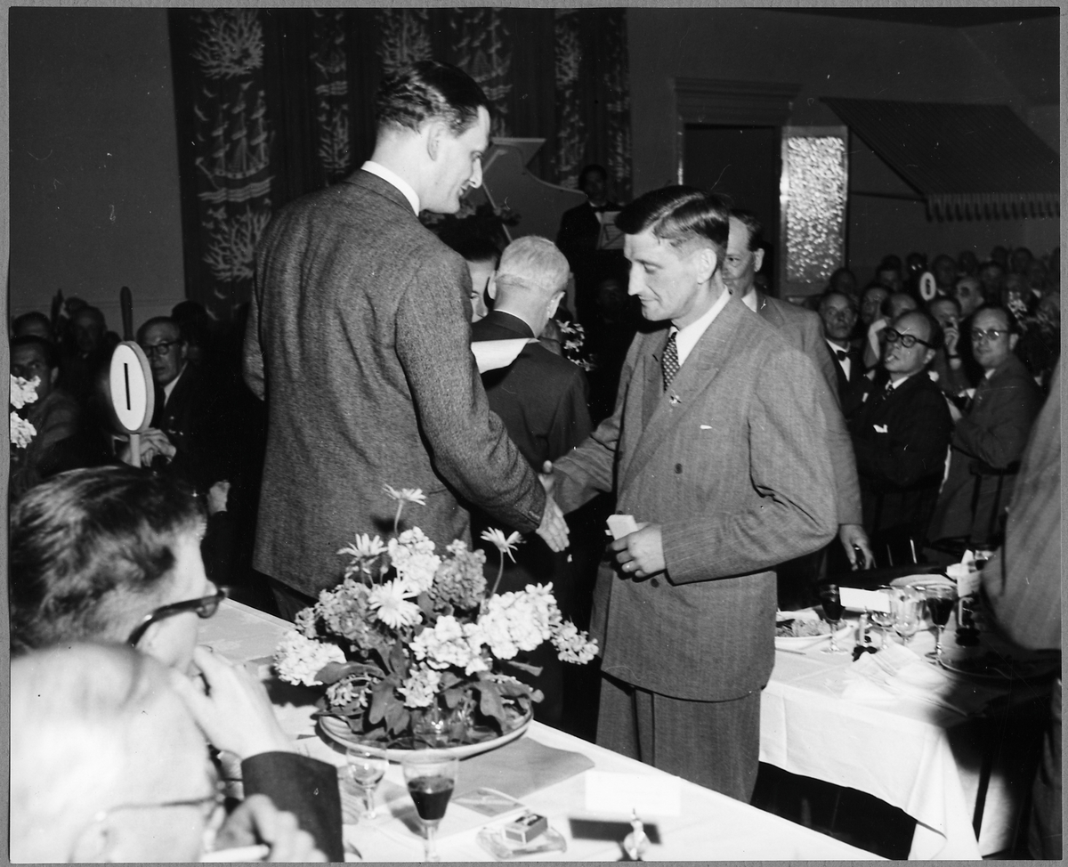Generaldirektör Erik Upmark delar ut Kungamedaljen "för nit och redlighet i rikets tjänst" till personal som under en lång tid jobbat med elektrifieringen av banan Borås - Strömstad.