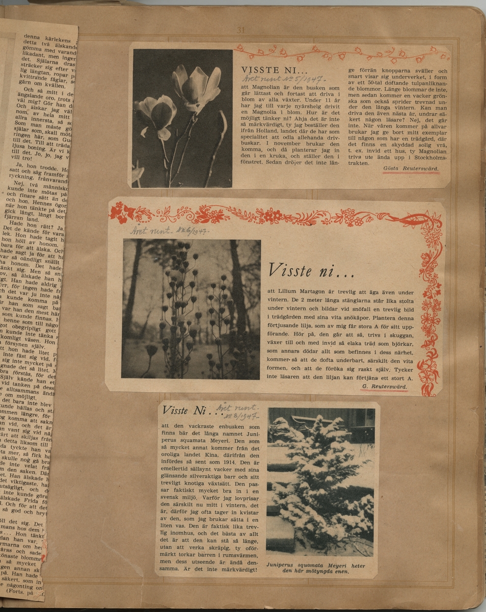 Tidningsklipp ur "Uppsatser om trädgårdar m.m. som på ett eller annat sätt beröra Gösta Reuterswärd. Samlade av Ernst Hj."